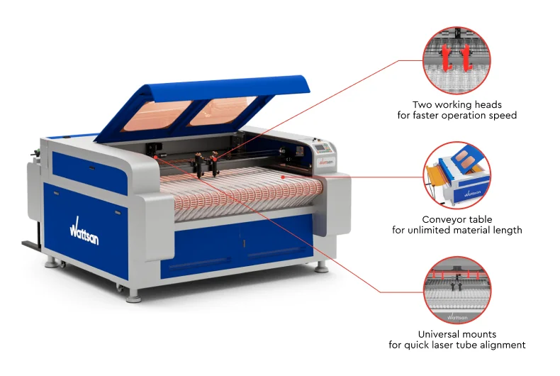 Enjoy the cleanest cut with the Wattsan 1610 Duos Conveyor on wide variety of materials, especially fabric. The two heads work synchronously with a minimum distance of 130 mm from each other, which speeds up the production process.UV TT
